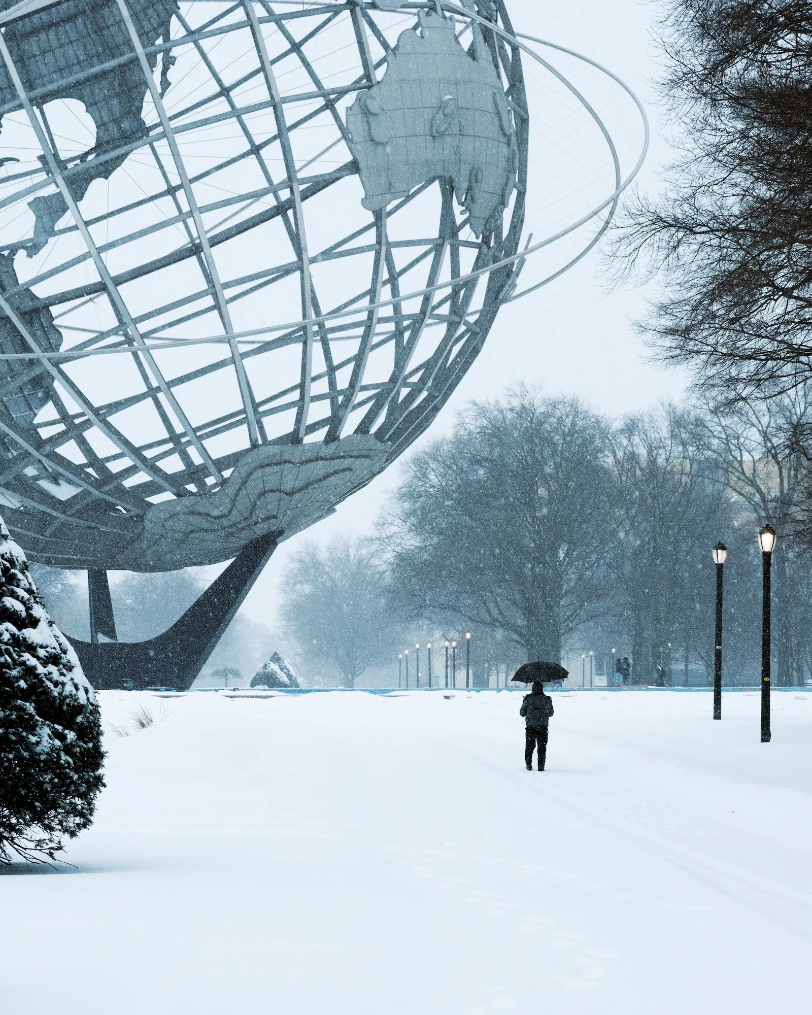 January 25th, 2026 - Man photographs the unisphere duringa winter snowstorm.